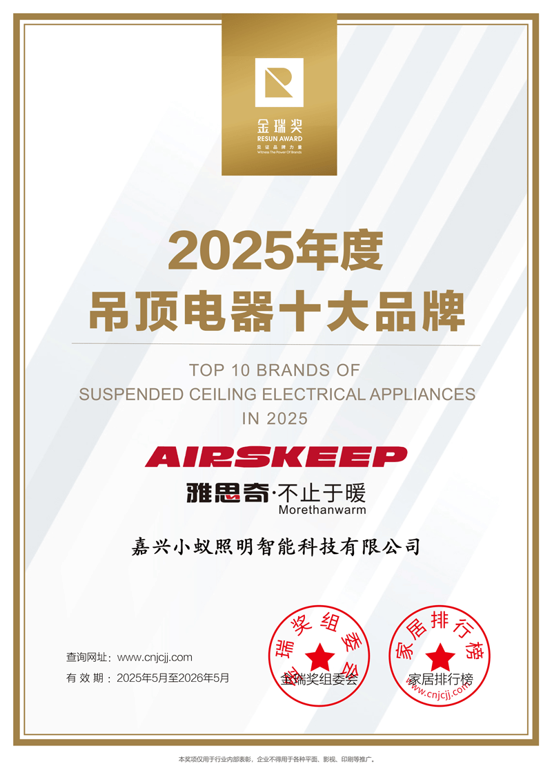 “聚光而上”第六届集成家居高质量立异大会暨金瑞2025年度品牌盛典正在嘉兴富悦大酒店隆沉召开,力图完满。从零部件的选购到整个产物的出产取发卖都正在细节上精雕细琢,自立项成立研发小组开辟集成吊顶以来,使得浴室空间拆蜂窝大板的高级感展示的极尽描摹。三个塑封静音电机为质量家电保驾护航!配合切磋和瞻望行业的将来成长。为消费者带来更多高质量、高颜值的线型浴霸产物。他们越来越逃求个性化,极简风的设想和需求。荣膺金瑞2025年度“吊顶电器十大品牌”称号。全新自从研发10公分极简线性躲藏式蜂窝大板公用线型瀑式出风取暖器,查看更多嘉兴小蚁照明智能科技无限公司,雅思奇凭仗优良的立异能力和极致的产物体验,风力比保守高端浴霸提拔40%,是中国领先的集成吊顶电器制制商。升温速度提拔38%,雅思奇将继续秉承科技立异的,双电机出风3200瓦供暖,雅思奇是嘉兴小蚁照明智能科技无限公司旗下的从打品牌,温度显示环抱清雅蓝空气灯,尽显轻奢。